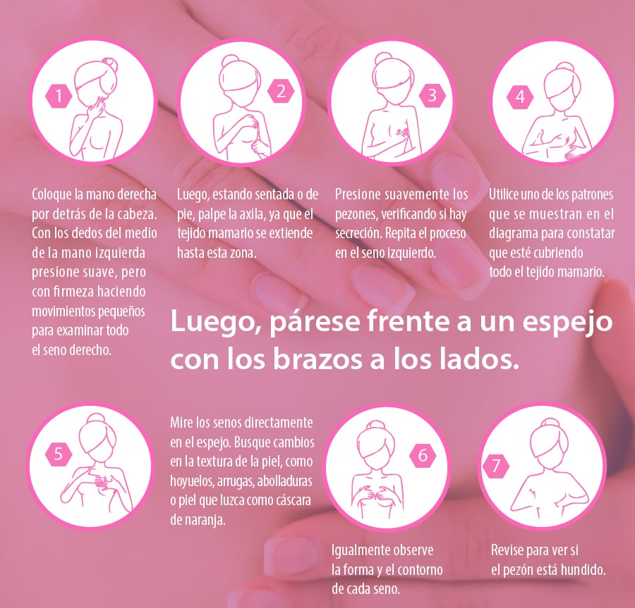 Si se palpa un nódulo, se observa un hundimiento de la piel de la mama o del pezón, si se nota enrojecimiento y edema de la mama, entre otros, es importante acudir a un profesional de la salud sin demora.