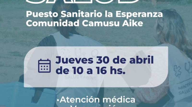 El Ministerio de Salud y Ambiente llevará adelante una nueva jornada de atención en el Puesto Sanitario La Esperanza y en la comunidad de Camusu Aike el próximo jueves 30 de abril, de 10:00 a 16:00 horas.